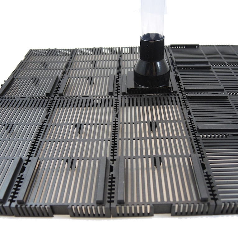 Das Steigrohr für den Wasserauslauf kann an jeder der Bodenplatten angebracht werden, somit ist der Filter auch in geteilten Aquarien, mehr-eckigen Formen usw. verwendbar. Die Luftzufuhr erfolgt praktisch und versteckt durch das Steigrohr und ist damit nicht sichtbar.
