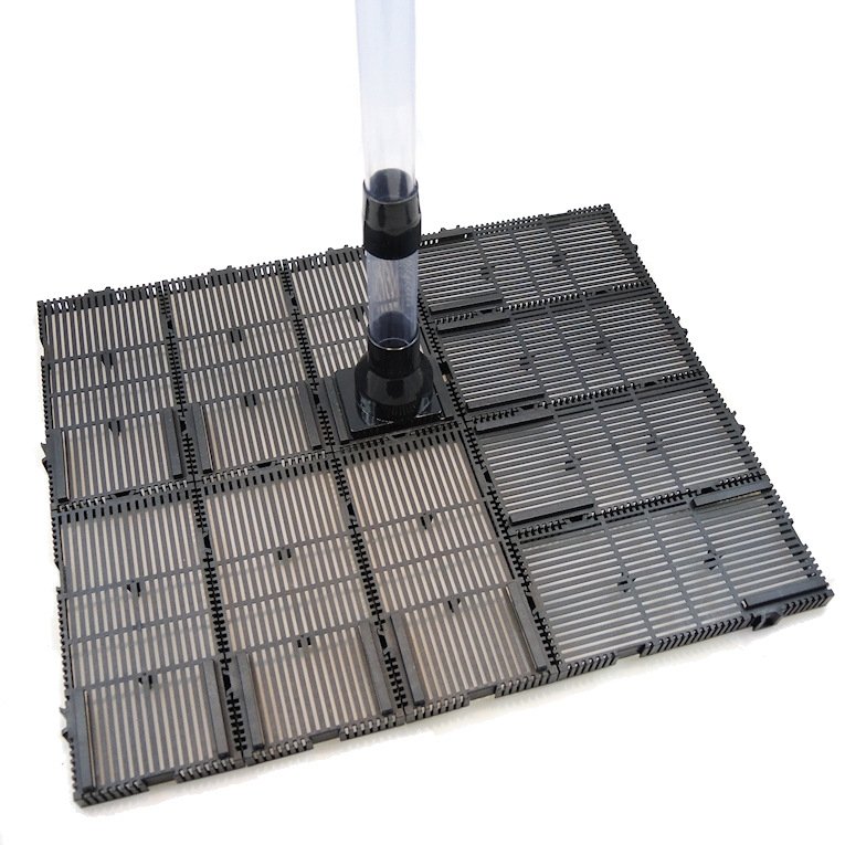 Food or plant residues cannot form any rotting spots, as oxygen-rich water always flows through the substrate and thus all residues are completely broken down by bacteria. The filter can be enlarged indefinitely, appropriate base plates are available for expansion.